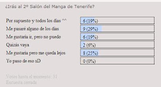 Aquí dejo constancia de los resultados de la encuesta planteada en este blog sobre el 2º Salón del Manga de Tenerife.